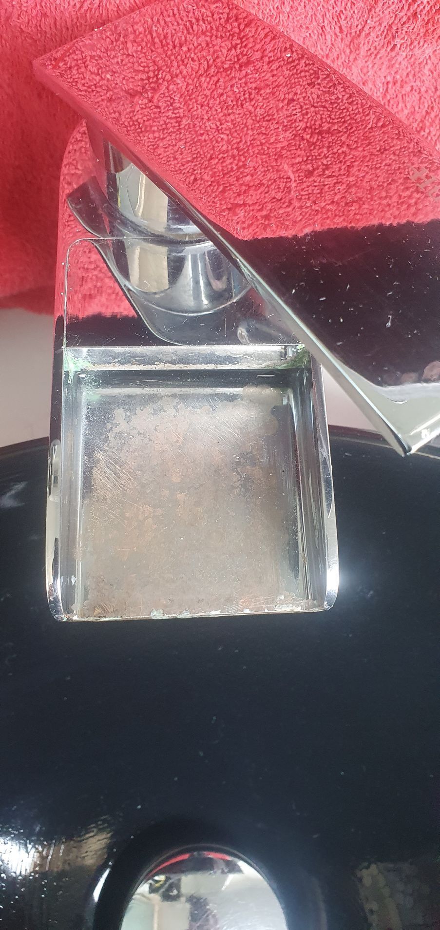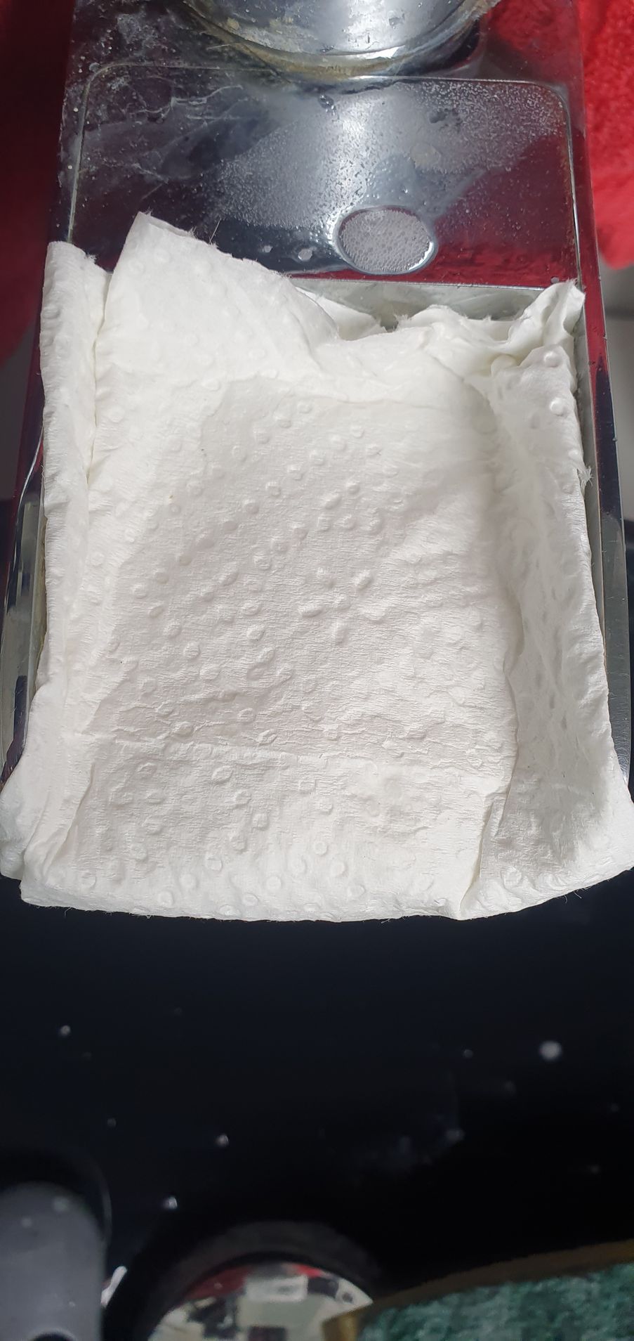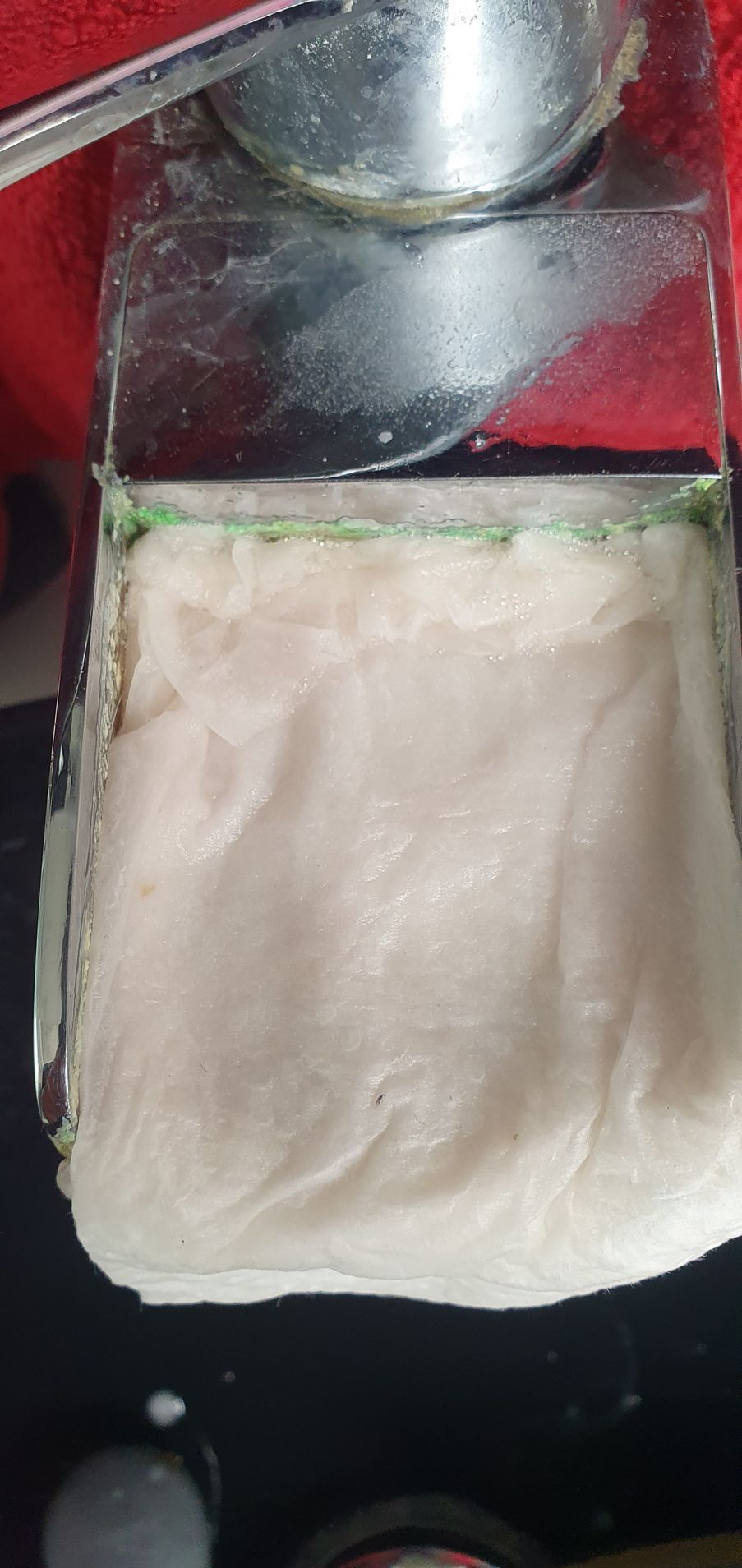 2) Le placer sur le robinet d'eau pour vérifier que toutes parties avec du calcaire sont couverts par l'essuie-tout